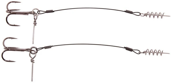 Deze stinger is gecombineerd met schroefbevestiging en pin om de stinger gemakkelijk en nauwkeurig op zacht kunstaas te monteren. De schroefbevestiging dient voorin de softbait gemonteerd te worden en de stinger kan vervolgens met de pin onder de softbait worden geplaatst (zie afbeelding). Door deze bevestigingspin zijn alle 3 de haakpunten vrij, wat de inhaking bevorderd. Afgewerkt met een Dragon V-Point dreg en AFW Surflon 1×7 in een zwarte nylon coating.