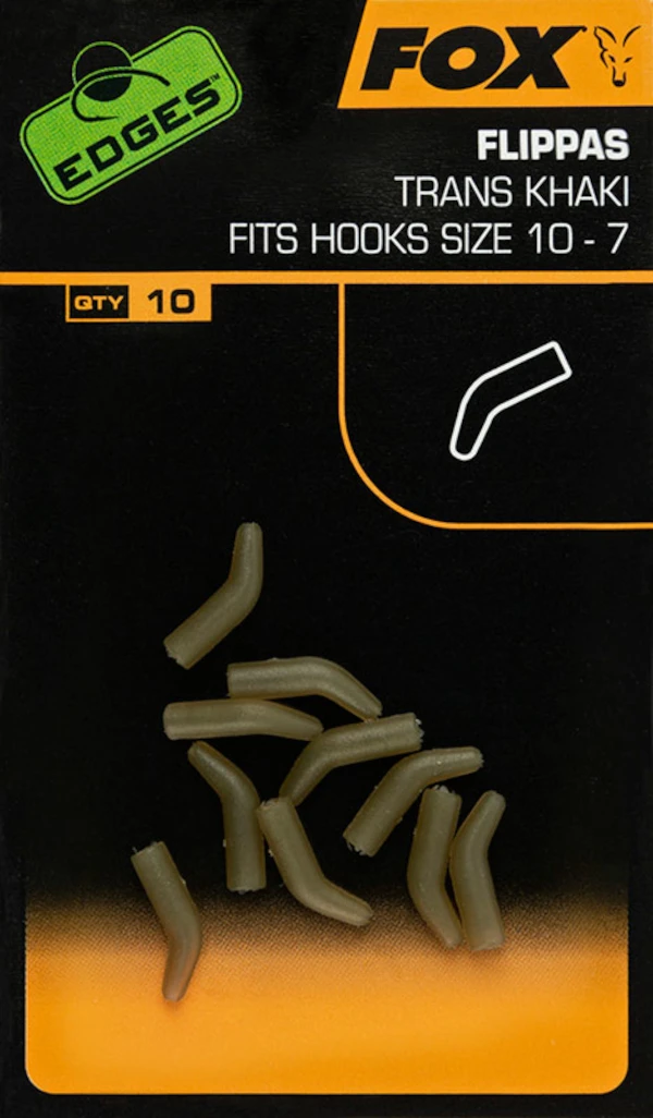 De Fox Edges Flippas zijn in meerdere varianten verkrijgbaar. Deze Flippas versnellen en bevorderen de inhaking. De haak komt nog agressiever op je presentatie te staan. Een krimpkous is bij het gebruik van Flippas niet meer nodig. Ze zijn Trans Khaki of Tungsten van kleur en zitten per 10 stuks in een verpakking. De Flippas mogen niet ontbreken tussen je end tackle materiaal!